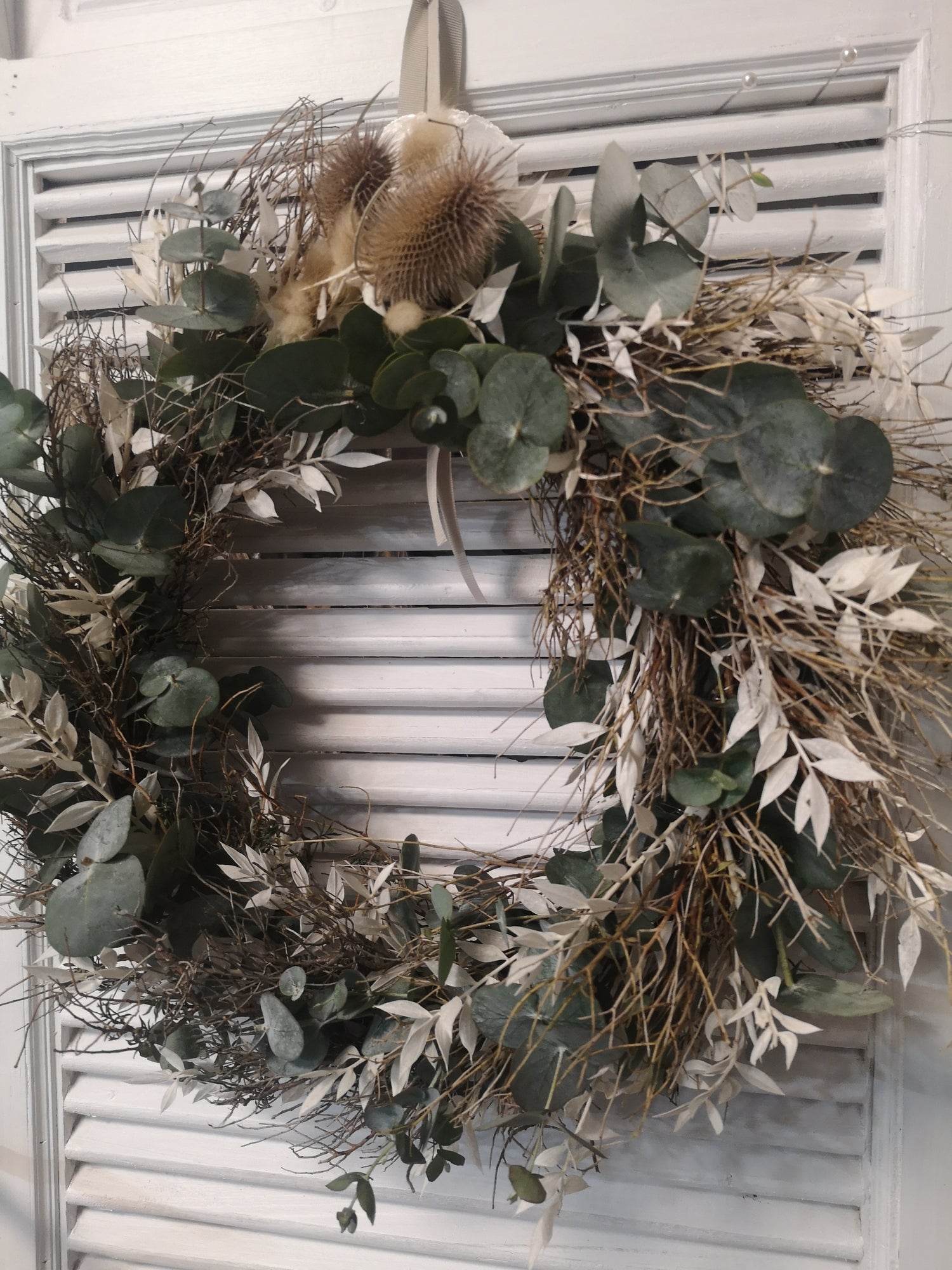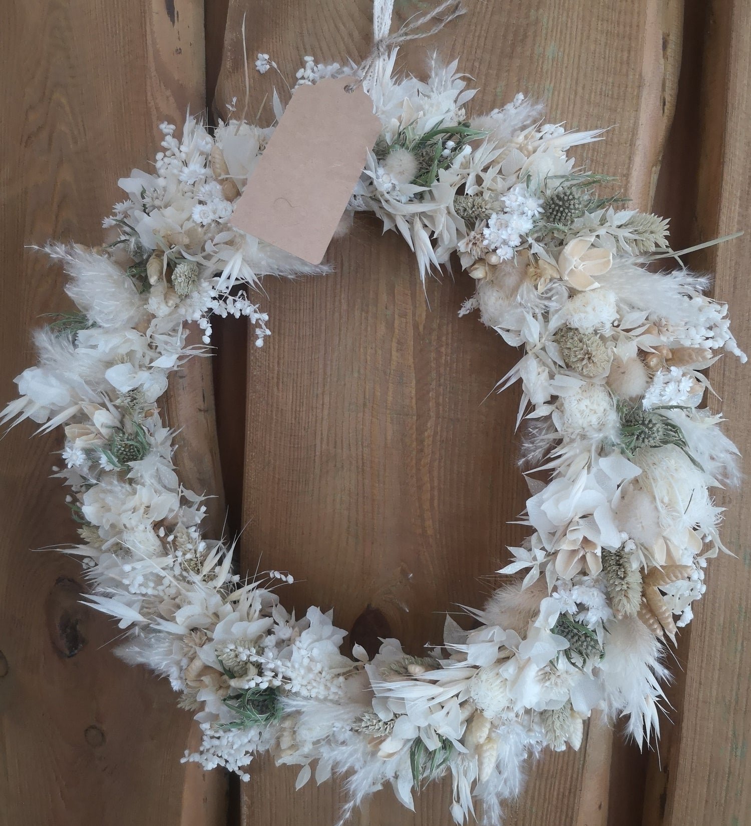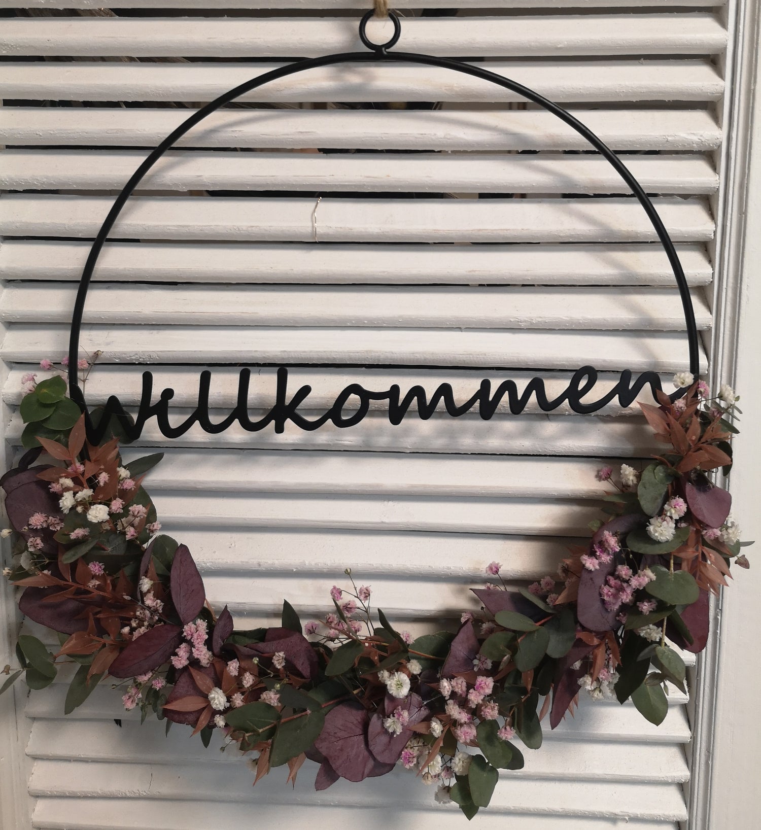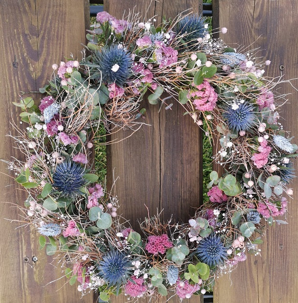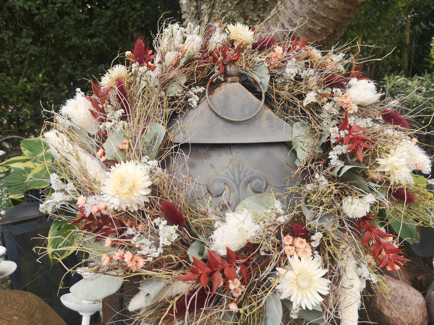 Handgefertigte Kränze hergestellt aus Trockenblumen, Zweigen, Bänder, frischen Blumen, etc.