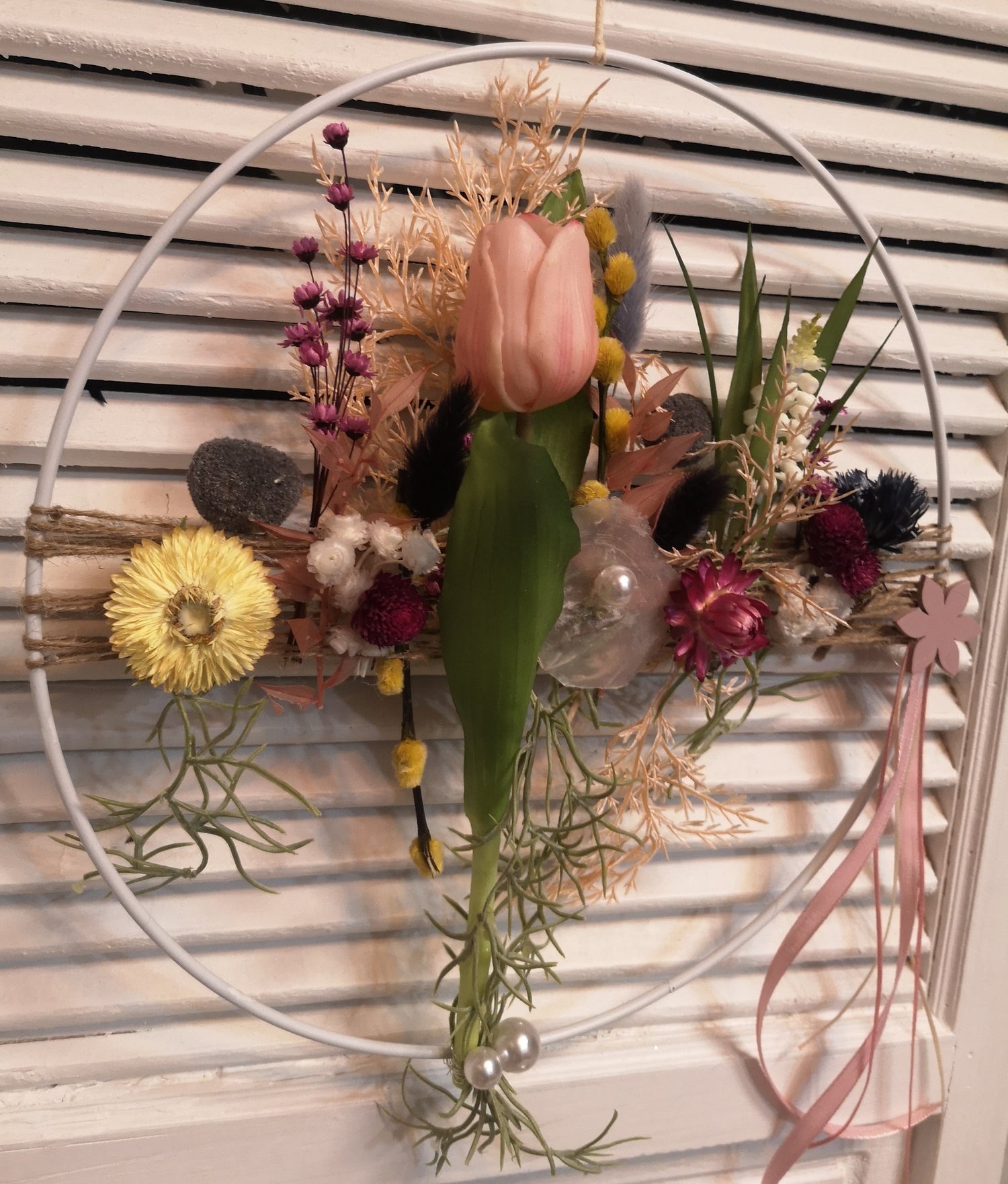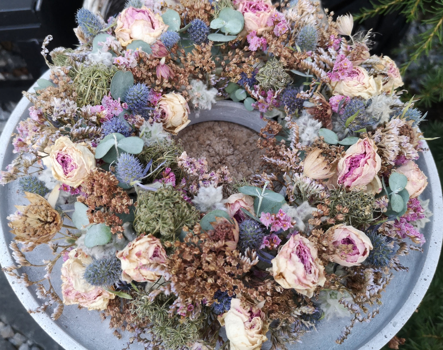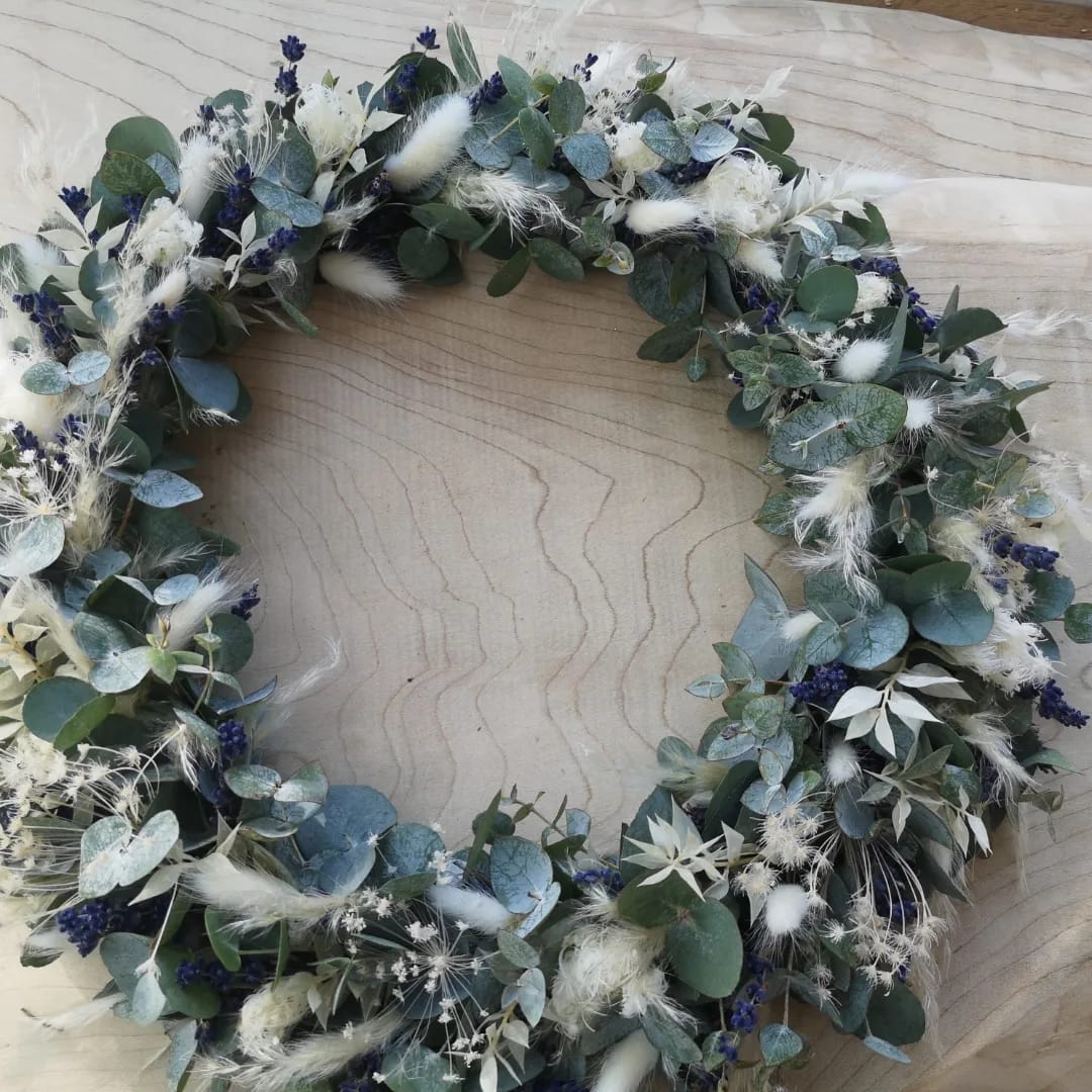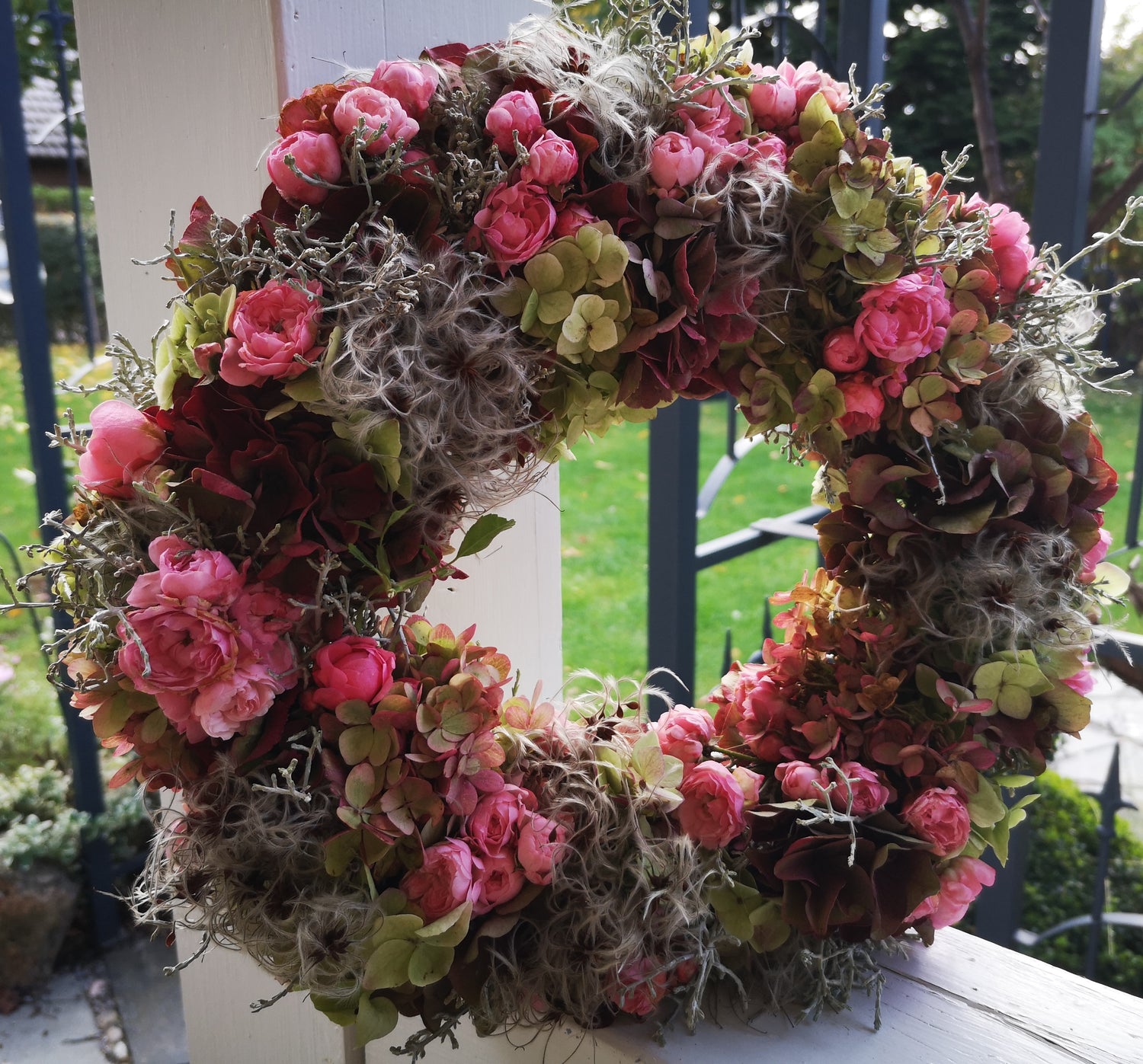 Handgefertigte Kränze hergestellt aus Trockenblumen, Zweigen, Bänder, frischen Blumen, etc.