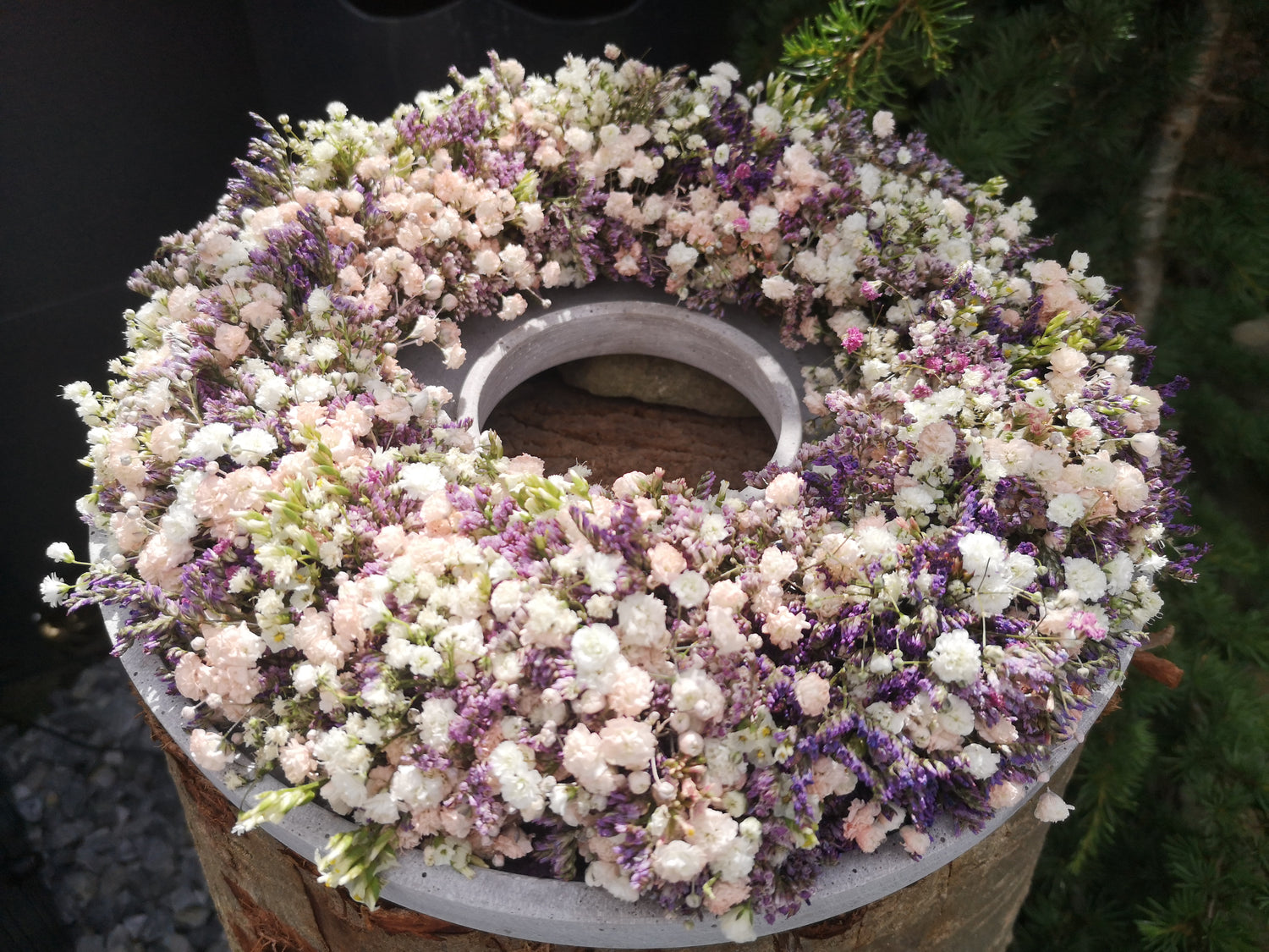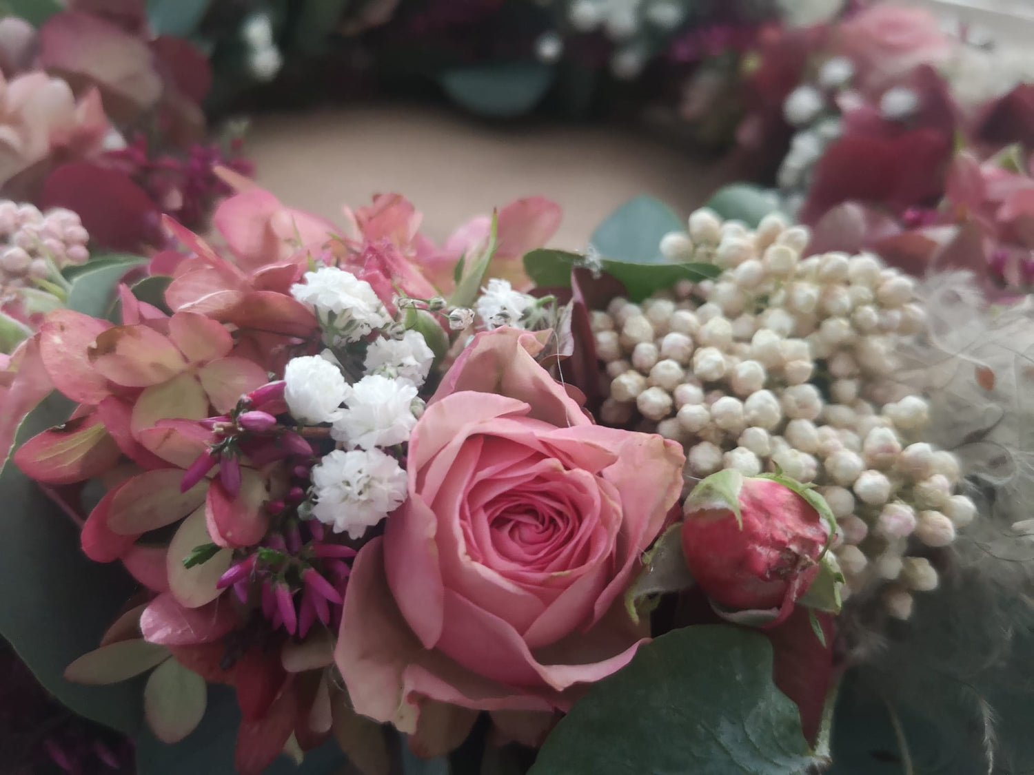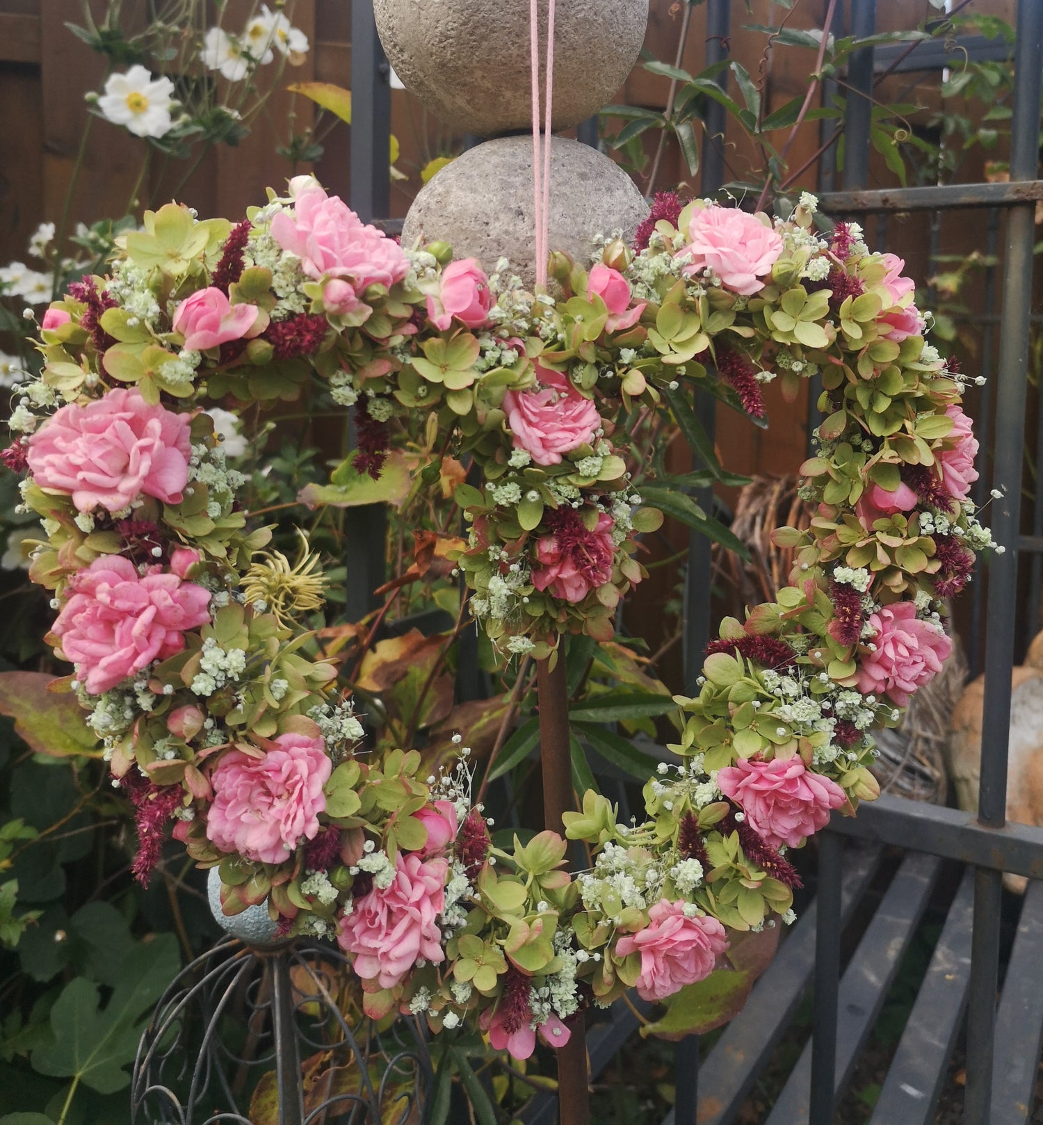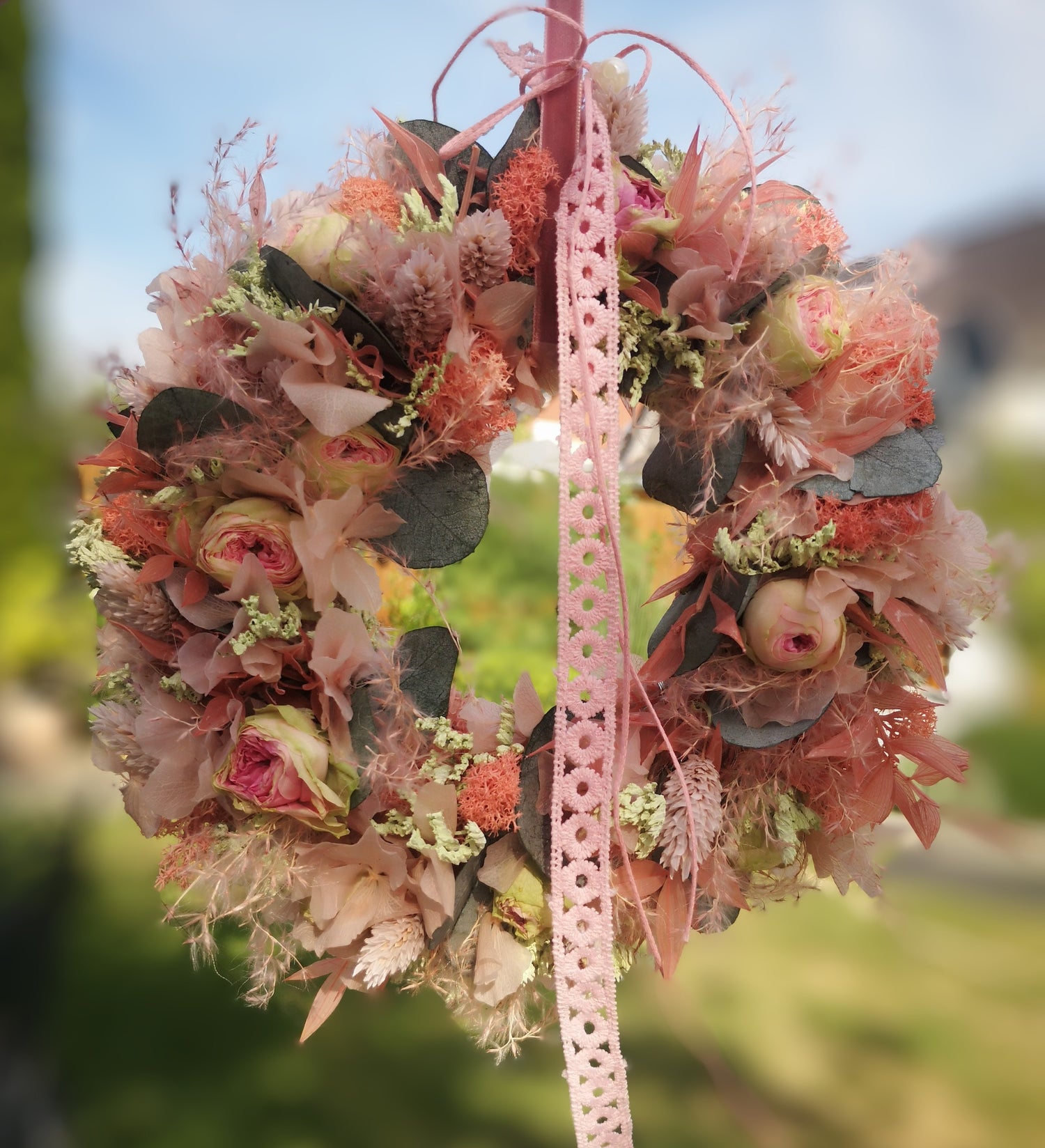 Handgefertigte Kränze hergestellt aus Trockenblumen, Zweigen, Bänder, frischen Blumen, etc.