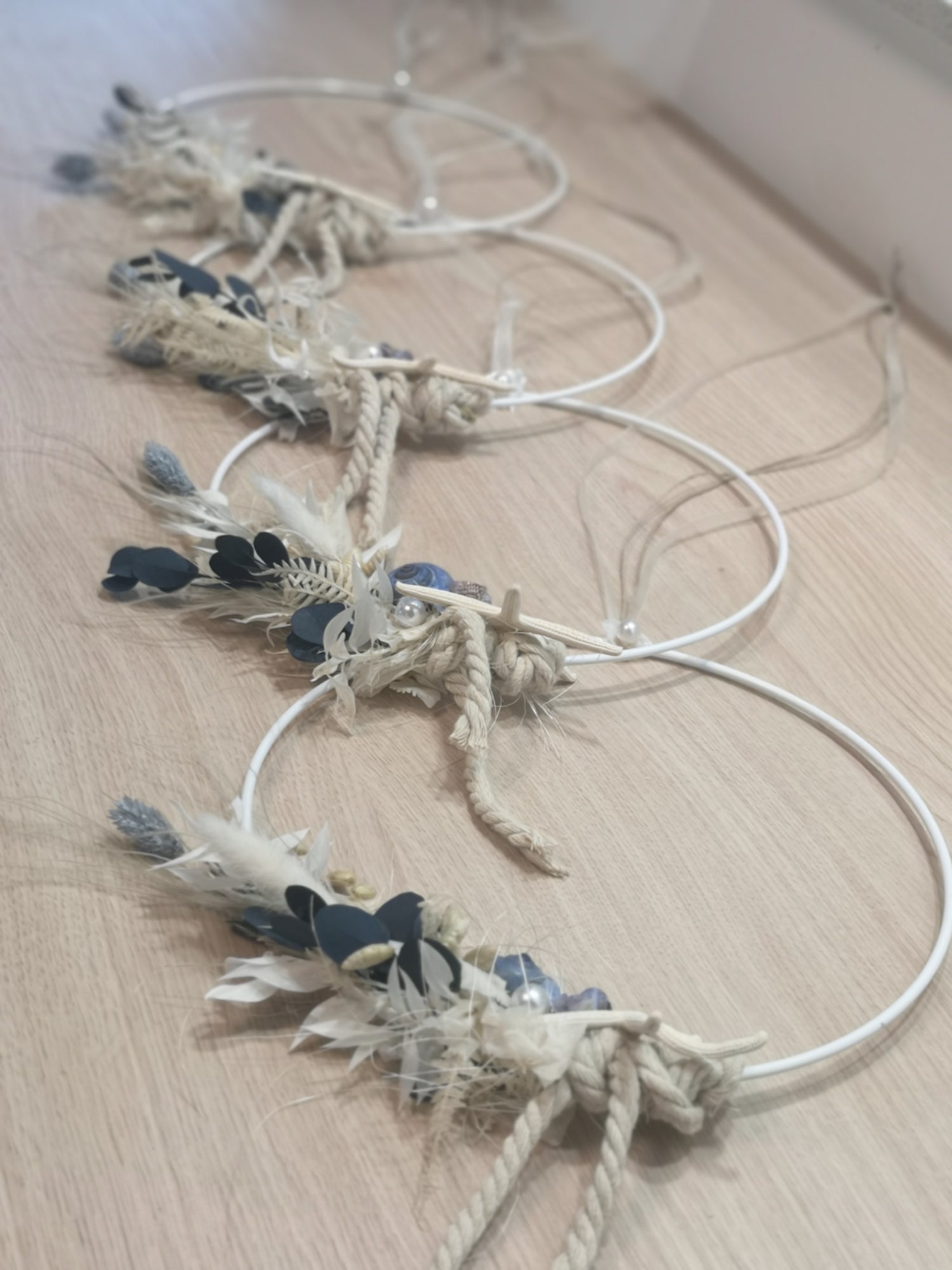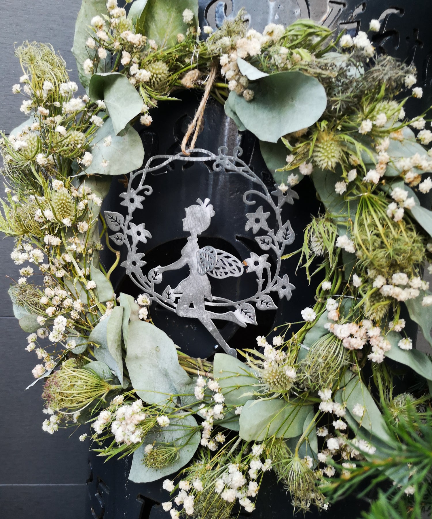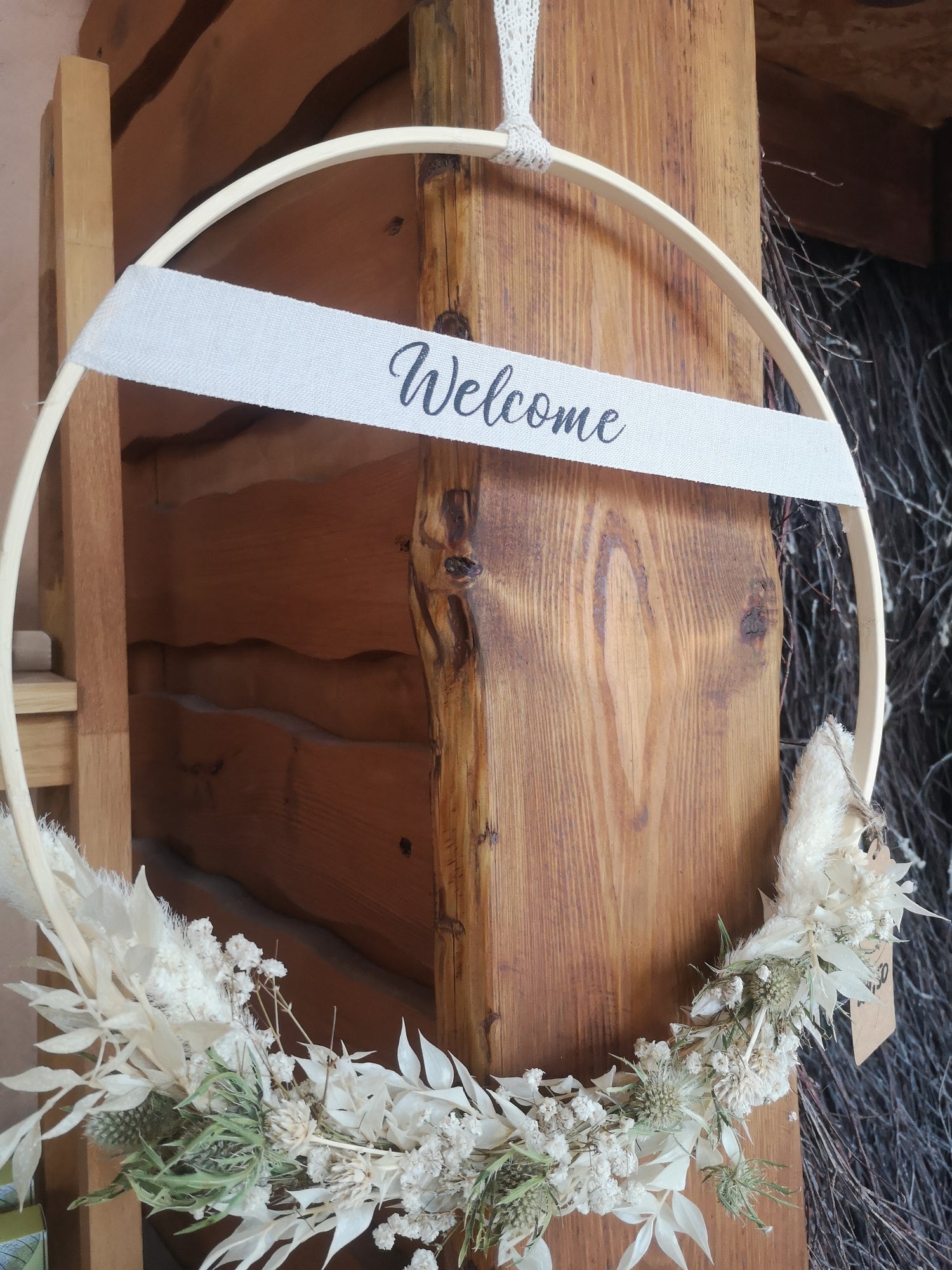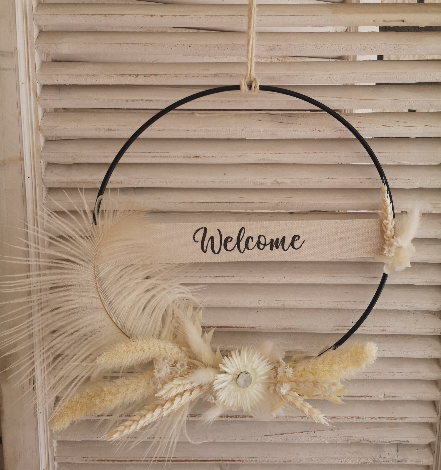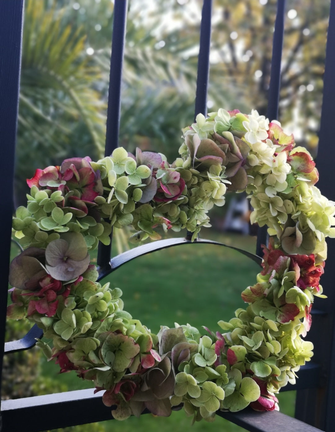 Handgefertigte Kränze hergestellt aus Trockenblumen, Zweigen, Bänder, frischen Blumen, etc.